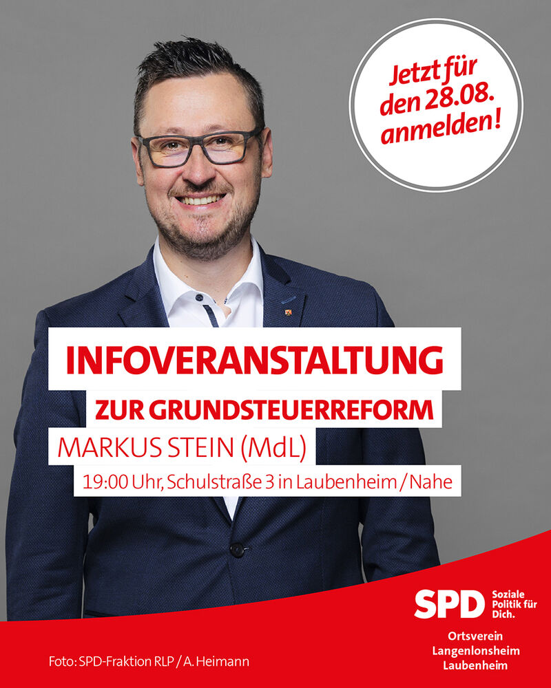 zum Thema Grundsteuerreform ein. Markus Stein ist seit 01. März 2019 Mitglied des Landtags Rheinland-Pfalz, Finanzpolitischer Sprecher der SPD-Landtagsfraktion und wird über die genannten Herausforderungen referieren.